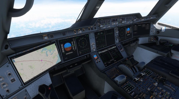Inside the cockpit, it's a computer geeks dream. Before you are 6 huge displays providing a wealth of flight information and leaving no questions about the state of your flight. It’s like the ultimate man cave. Screens, screens and more screens! Functionally everything seems to work just fine, but the downside to this high-tech wizardry is the performance hit your PC will take. Out of all the aircraft in my virtual hangar this one demands the most. I do appreciate the option of using the touch screen or actual buttons for the flight computer inputs. I like the feel a good button!